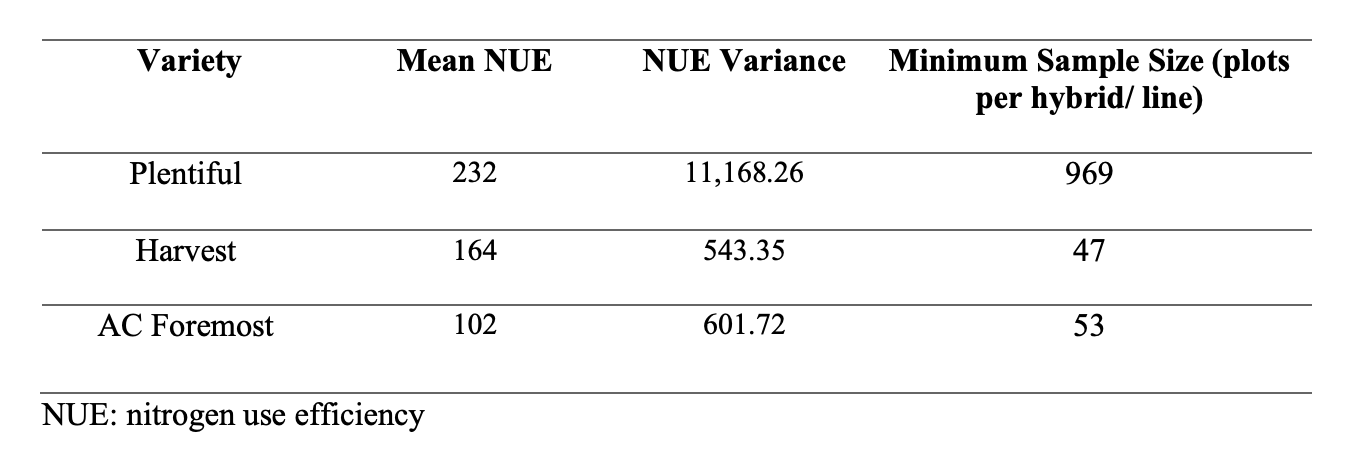 Statistical power considerations were also evaluated. The minimum number of sampling units required to detect a specified effect size was calculated using the formula shown, where N is the total sample size, σ² is variance, and D is the minimum detectable difference expressed as a percentage. A Z₍crit₎ of 0.05 and power of 80% (β = 0.8) were used. The estimated number of samples required to detect a 10% difference in NUE relative to the variety AC Andrew is reported.