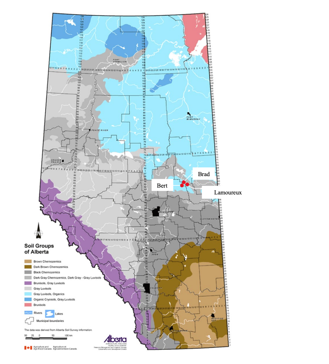 This project was conducted across three commercial sites located north of Edmonton in Sturgeon County, Alberta, Canada. All sites are predominantly characterized by moderately fine-textured Black Chernozemic soil, with an average growing season precipitation of 286 mm and a mean growing season temperature of 2.67 °C. Each site is managed under conventional tillage and used for arable cropping. A rotation of wheat (Triticum aestivum L.), canola (Brassica napus L.), and field pea (Pisum sativum L.) is followed at the Bert site (53°51'13.4"N, 113°14'06.8"W), while a wheat–canola rotation is used at the Brad (53°51'41.6"N, 113°14'49.3"W) and Lamoureux (53°50'06.5"N, 113°12'14.5"W) sites (Figure 2.1). Variable rate urea (46-0-0) applications for 2015 at the Bert and Lamoureux sites are shown in Figure 2.2, with green, yellow, and red pixels representing different application rates.