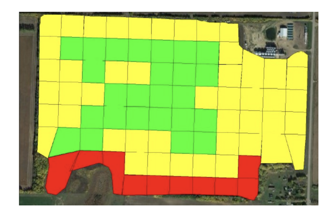 Figure 2.1. Map showing soil groups of Alberta. The geographic location of three study sites is indicated by red dots. Image courtesy: Alberta Agriculture and Forestry. Figure 2.2 (a). Variable rate application of urea (46-0-0) to the Bert site for year 2015. Green, yellow and red pixels illustrate 120, 100, and 87 lbs ac-1 of applied urea. Figure 2.2 (b). Variable rate application of urea (46-0-0) to the Lamoureux site for year 2015. Green, yellow and red pixels illustrate 76, 65, and 54 lbs ac-1 of applied urea.