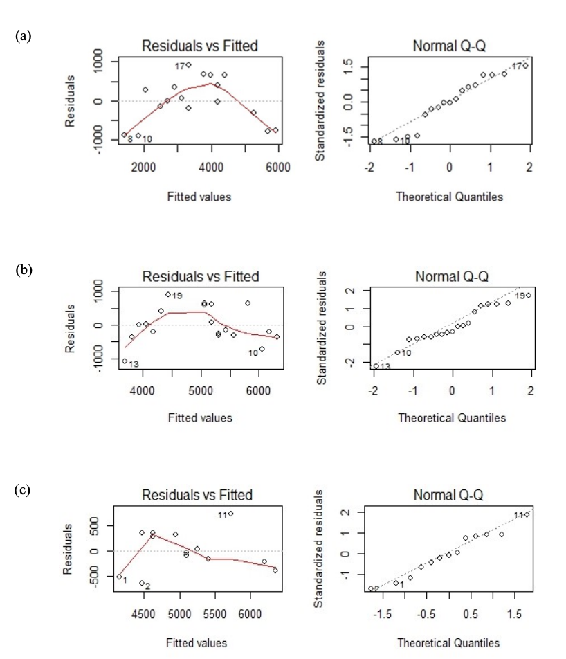 Regression diagnostic plots (Figure 2.4) reveal patterns in residual dispersion that violate linearity assumptions, indicating that linear models do not perform well for these data. Q-Q plots show that residuals are approximately normally distributed.