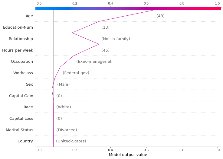 The decision plot’s straight vertical line marks the model’s base value. The colored line is the prediction. Feature values are printed next to the prediction line for reference. Starting at the bottom of the plot, the prediction line shows how the SHAP values (i.e., the feature effects) accumulate from the base value to arrive at the model’s final score at the top of the plot.